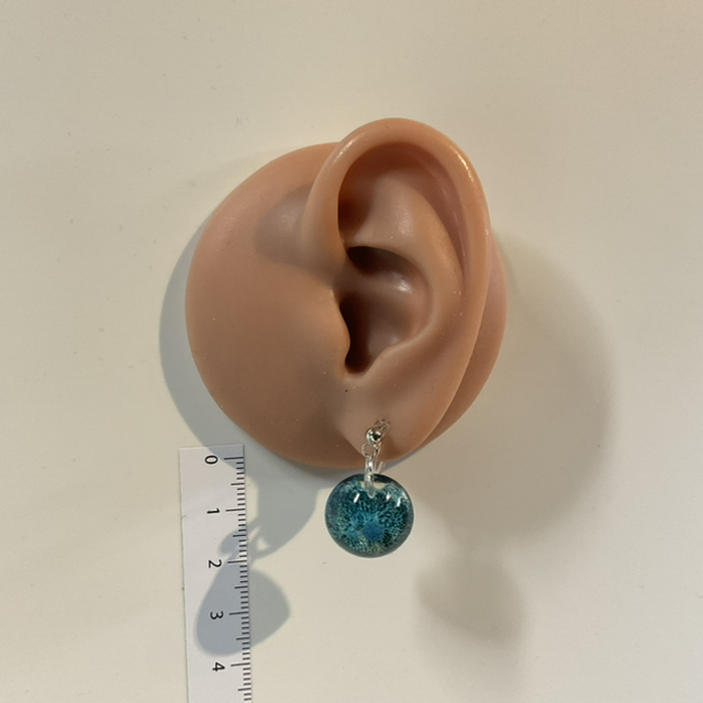 Handgefertigte Ohrhänger aus Kunstharz mit runder, gewölbter Form. Das Material ist tief blau-türkis, durchsichtig, mit feinen Petri Effect innen. Die Anhänger sind an Kunststoffclips befestigt und sie sind auch für Menschen geeignet, die kein Ohrloch haben.